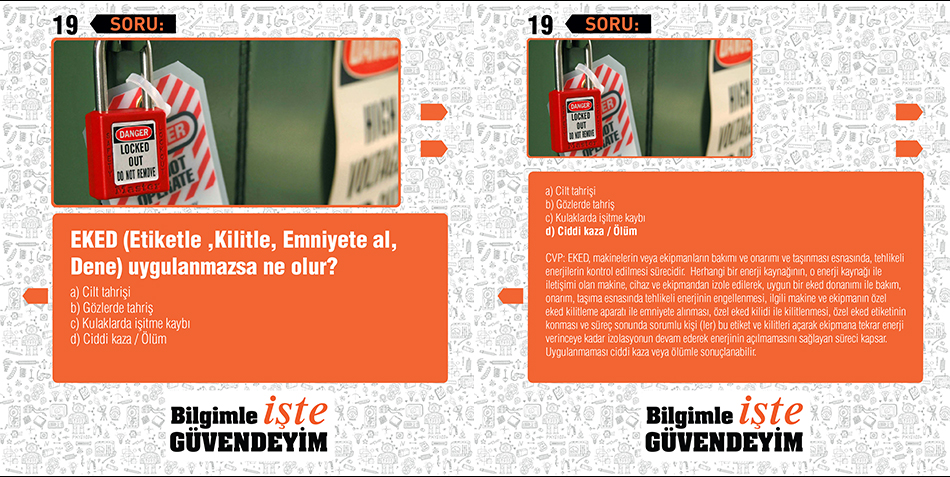 İSG kapsamında çalışanlarla paylaşmak istediğimiz bilgileri oyunlar oynayarak, eğlenceli bir şekilde paylaştık. Farkındalık oluşması ve mevcut uygulamaların pekiştirilmesi için başarılı bir uygulama. Teşekkür ederiz.Yahya Kemal KÖSALI Yönetim Sistemleri Müdürü